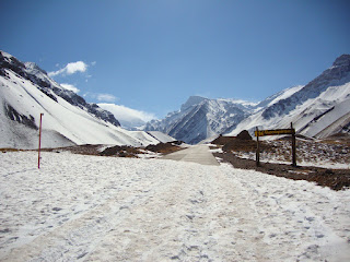 Depois do Parque Provincial Aconcágua, passamos pelo Túnel Cristo Redentor. Dentro do túnel começamos a ver placas indicando que já estávamos no Chile. Ao sair do túnel já estávamos no Chile! A paisagem foi ficando cada vez mais bonita – muita neve, estações de esqui, montanhas altíssimas e sol.